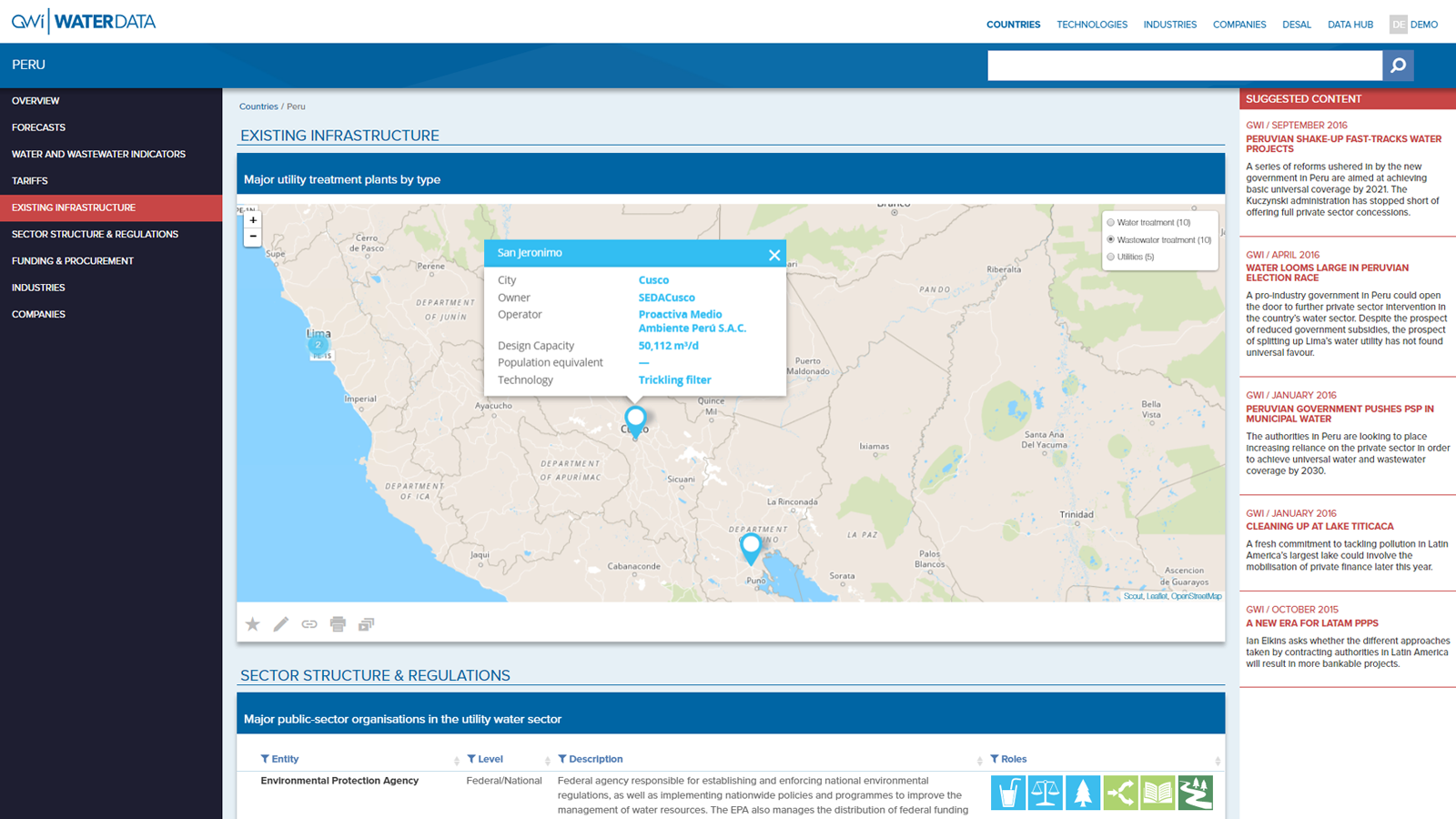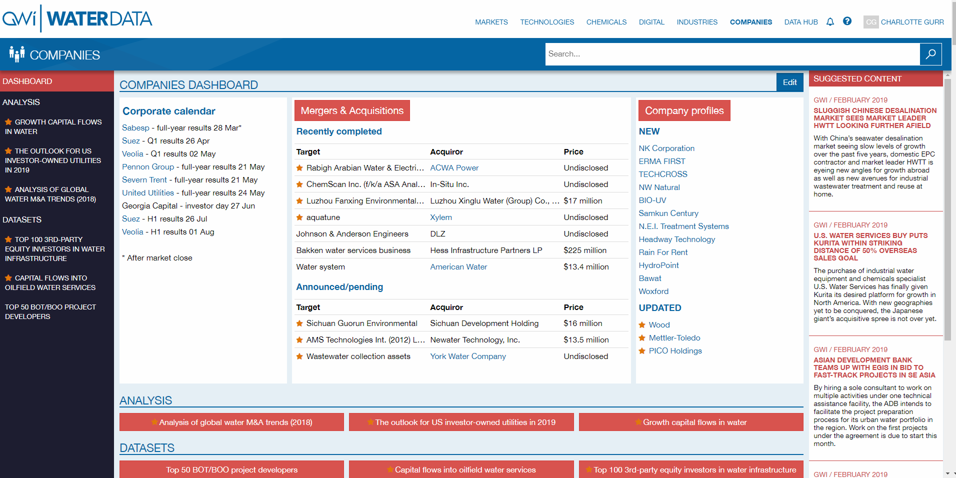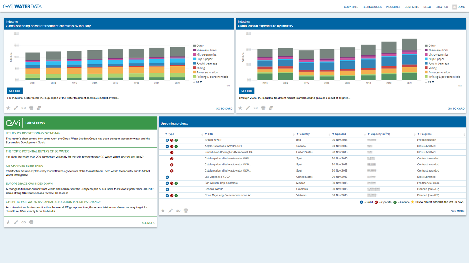 WaterData makes powerful connections. WaterData intuitively links the data and analysis with the rest of the platform, but it also draws on relevant content from other GWI products and external sources. For example, relevant news about a company is fed from GWI magazine into its WaterData company profile, and the top upcoming projects tracked by GWI magazine will appear on the WaterData homepage.