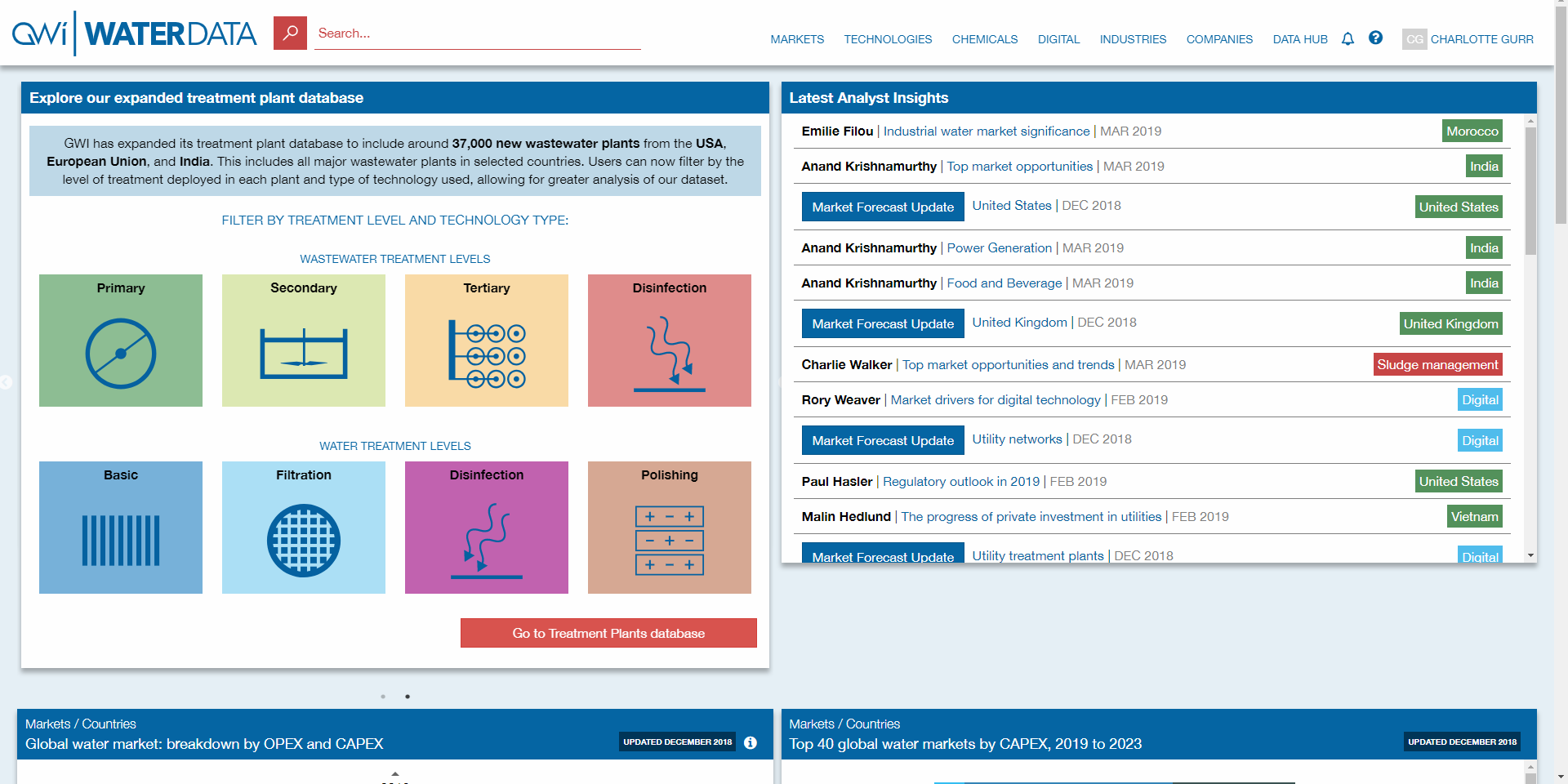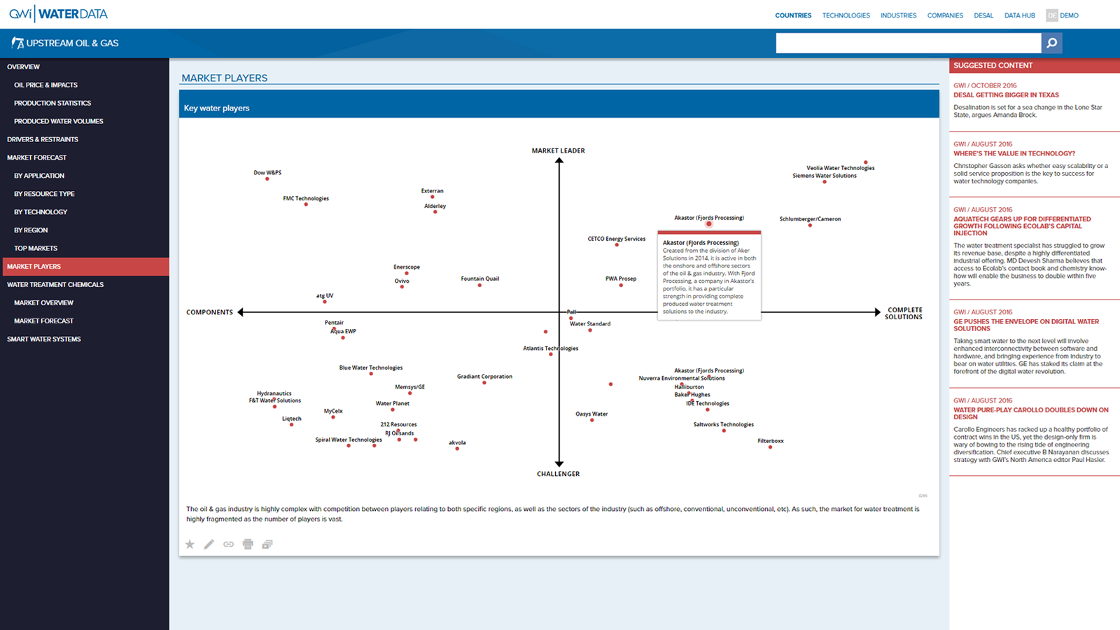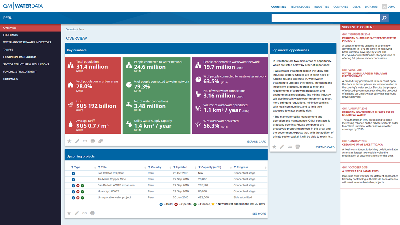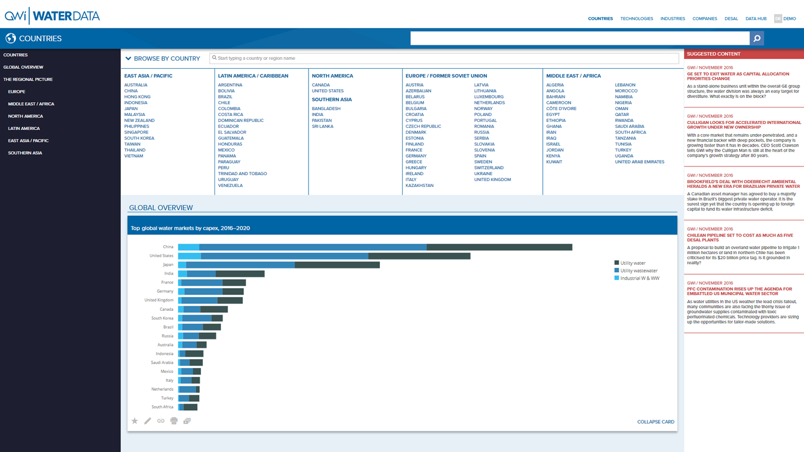 GWI WaterData understands that different users look for information in different ways – the top-level menu is merely a starting point for you to explore countries, technologies, industries and companies. Users can also move with ease between interconnected content, at different levels of granularity.